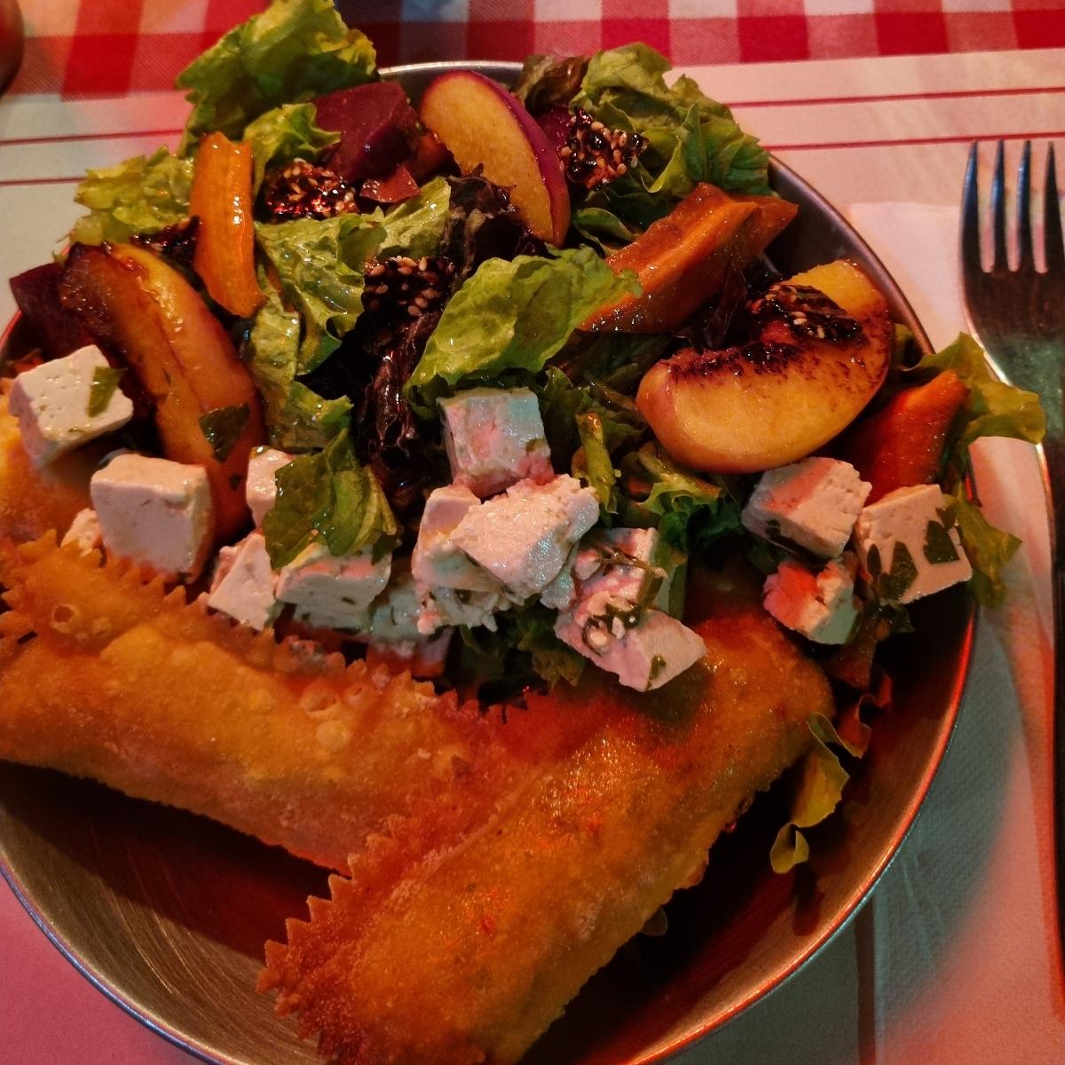 Es una ensalada de lechuga verde y morada con tofu crudo ( la verdad debería ser cocido, no me gusta crudo) semillas, durazno, y supuestamente verduras de estación asadas ( trajo 2 pedacitos de zanahoria).