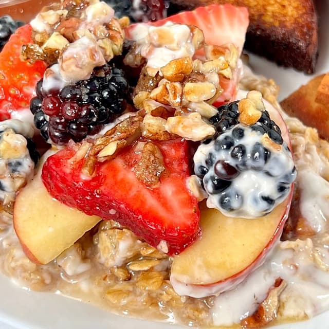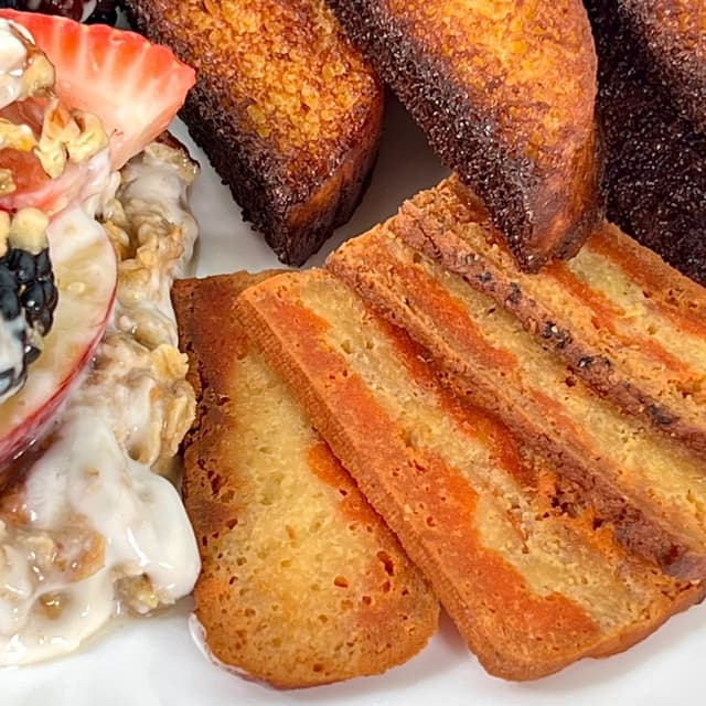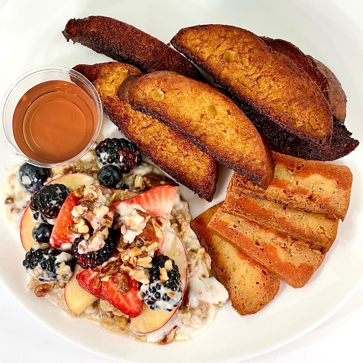 This consisted of a parfait with house-made granola, 🌱-based yogurt, and fresh fruit topped with cardamom candied pecans and drizzled with agave. Served with crispy, golden brown deep fried French toast sticks, maple syrup, and smoky, thick-cut 🐷-free Thrilling Foods Bakon. It had a wonderful variety of deliciousness.