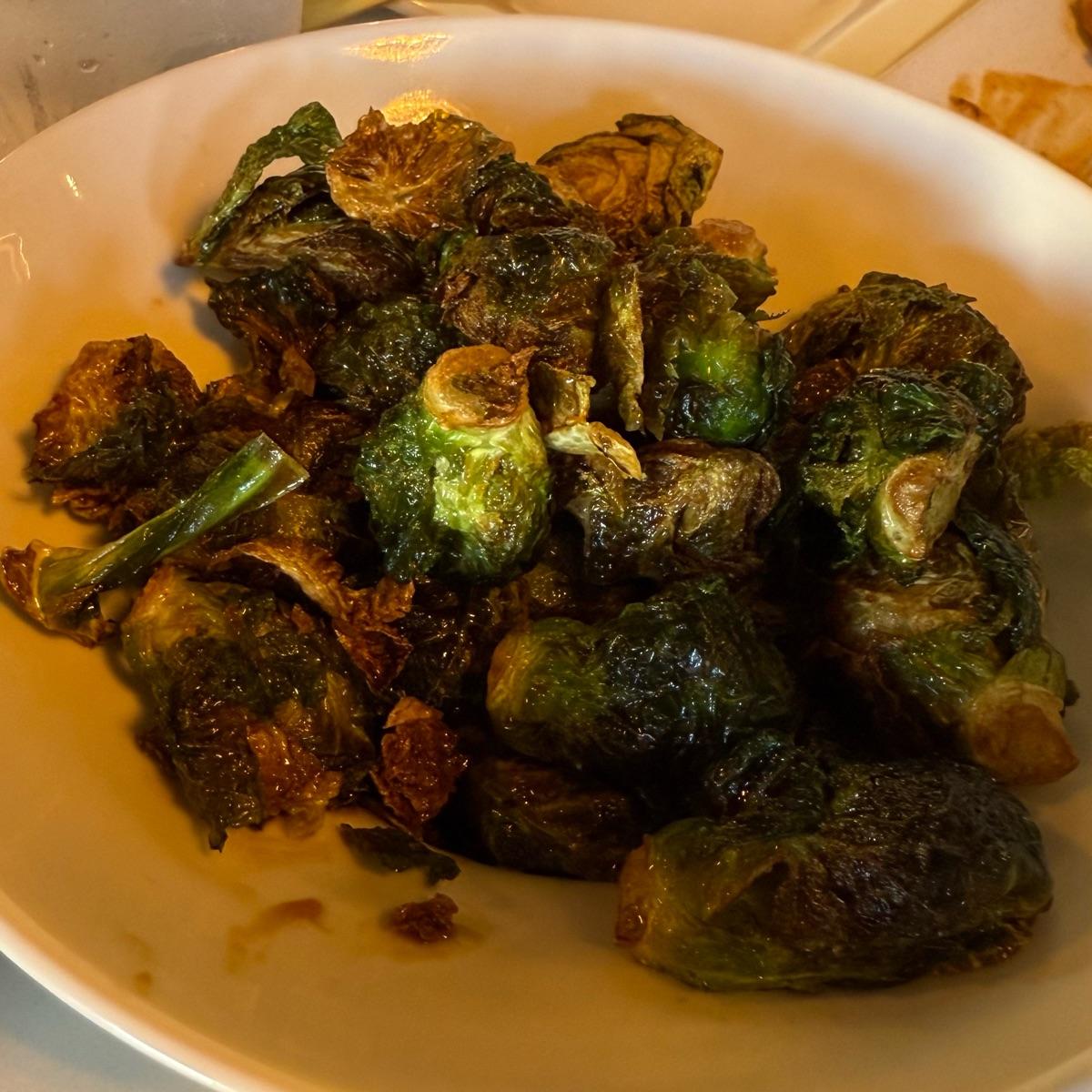This is soooo yummy! Request the Brussels sprouts to be modified and made without bacon and it’s vegan! We order this all the time. It’s tossed with maple balsamic glaze.
