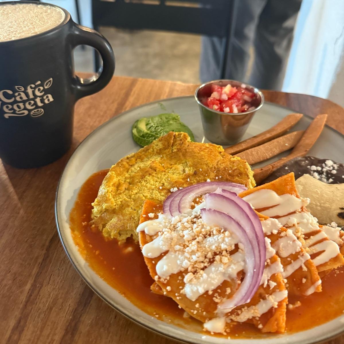 Este plato incluye tofu, chilaquiles, pico de gallo, frijolitos y dos salchichas. Vale la pena si no te decides que pedir y así pruebas un poco de todo 😬