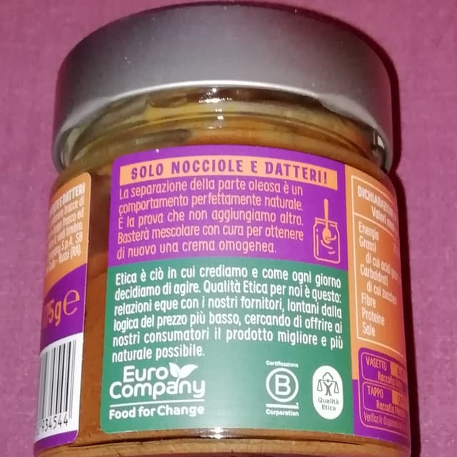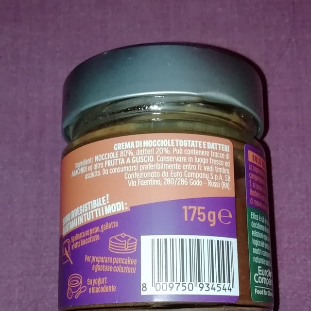 Ormai ho recensito moltissime creme 100% frutta secca perché le mangio sempre a colazione spalmate su pane o fette biscottate. Questa di Euro Company è la prima volta che la vedo. Come si apre la confezione si percepisce il buon profumo della nocciola; il colore è marrone scuro lucido, cioccolatoso. All'assaggio, è ottimo il sapore della nocciola (80%) che si associa golosamente al sapore dei datteri (20%). Insomma, 2 golosità in una. Menomale che la confezione è piccola perché il primo impulso sarebbe quello di mangiare questa crema a cucchiaiate come se non ci fosse un domani.