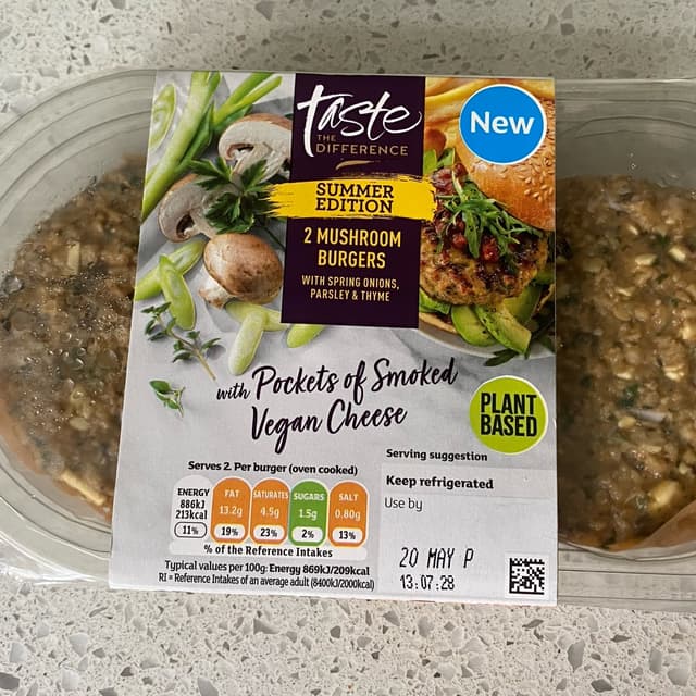 In terms of vegan patties, this is probably of the best I've ever had. Smoked vegan cheese pockets in between make for a beautiful crisping on the outside while the inside remains moist and juicy. I cooked them in the oven, from chilled, according to package instructions but with 5min extra (15min, turn, then 15min again) and they were golden brown on the outside and soft on the inside, well cooked through. I wish these were in my home country! #veganburger #veganforlife #mushroomburger #vegansainsburys