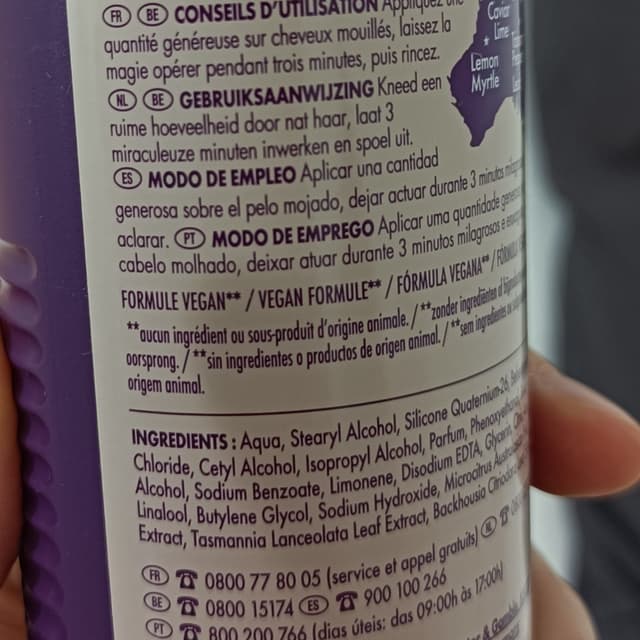 Tratamiento para el cabello maltratado. Hay que aplicar con el cabello húmedo, dejar actuar 3 minutos y aclarar.