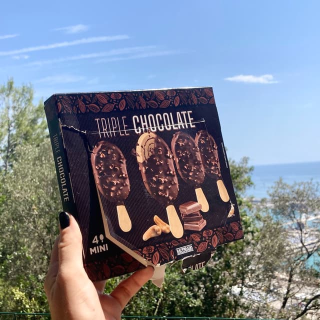 Cashew-based chocolate ice cream covered with bitter chocolate and pieces of cashew. I liked that it was not too sweet, and it cost 2,70€ for 4 ice cream sticks #reviewwithaview