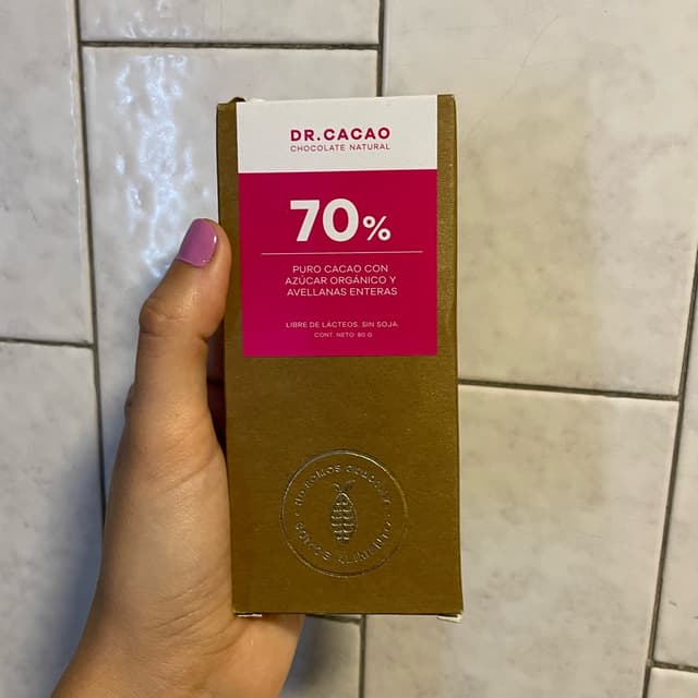Es muy muy rico. Es fuerte al ser de cacao 70% pero, las avellanas le dan un toque suave. Muy recomendable. El envase de cartón reciclable. Todo perfecto!