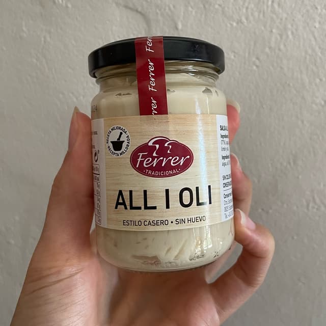 Bote de allioli sin huevo. Está muy rico de sabor.