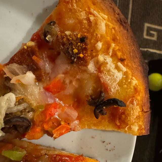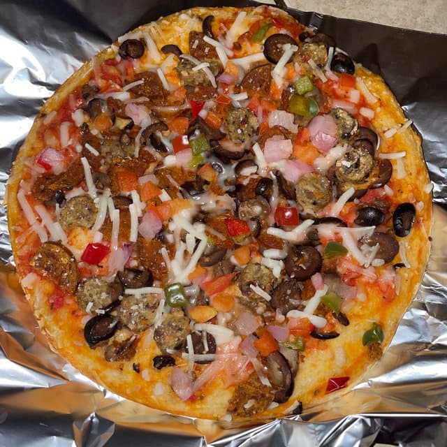 Comes with onions, mushrooms, bell peppers, faux pepperoni/sausage. Weirdly the nutrition facts say a serving is 1/3 of a pizza who does that lol.