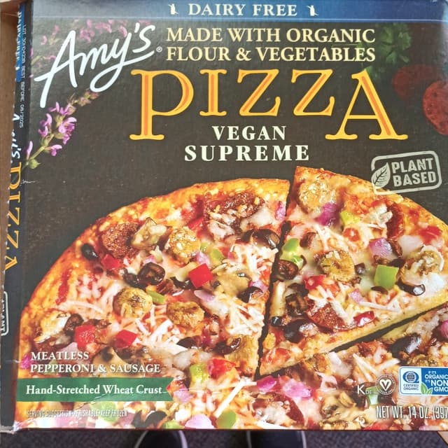 I love Amy's products because they use lots of organic ingredients. This vegan supreme pizza is taste bud satisfaction! Like most frozen meal items, it is very high in sodium. Half of this pizza is half the amount of salt to consume in a day (under 2000 daily). I usually buy this pizza because it's reasonably priced and share it with my Uncle Rick (omnivore) when we get together to play Nintendo Wii. I regularly buy this pizza.