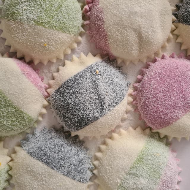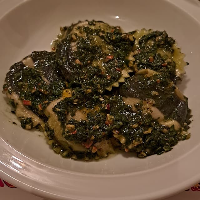 La masa es siempre perfecta, pero este relleno no es de mis preferidos. La calabaza invade mucho, solo se siente ese sabor. Los hongos de pino yo ni los noté. Entonces queda un relleno de puré y yo prefiero más textura, más densidad. El sabor general es rico, pero no los elegiría habiendo otros tanto mejores.