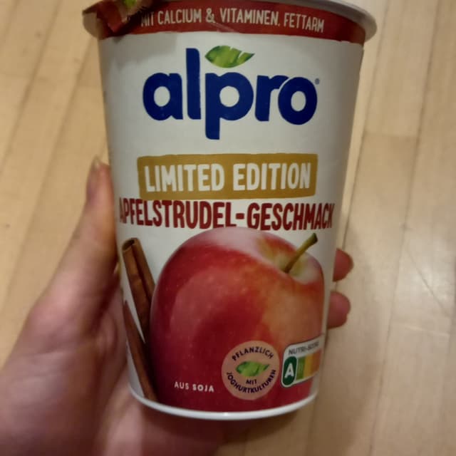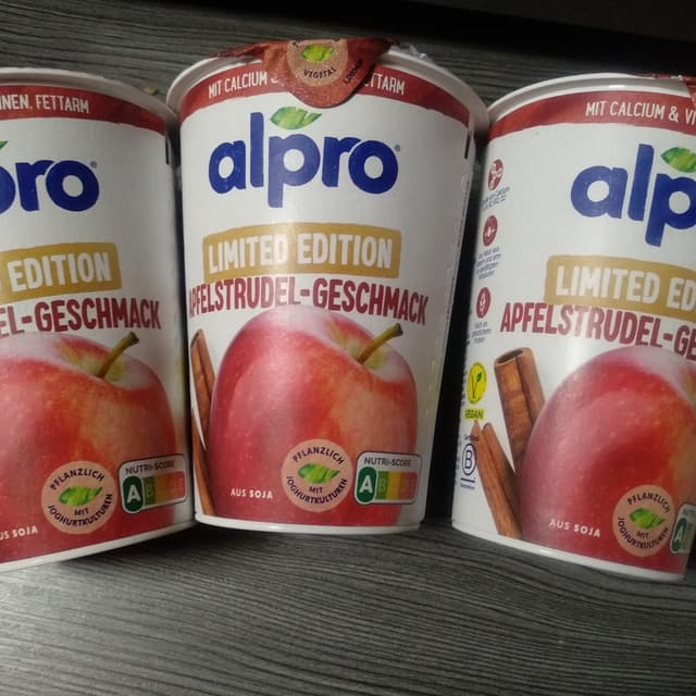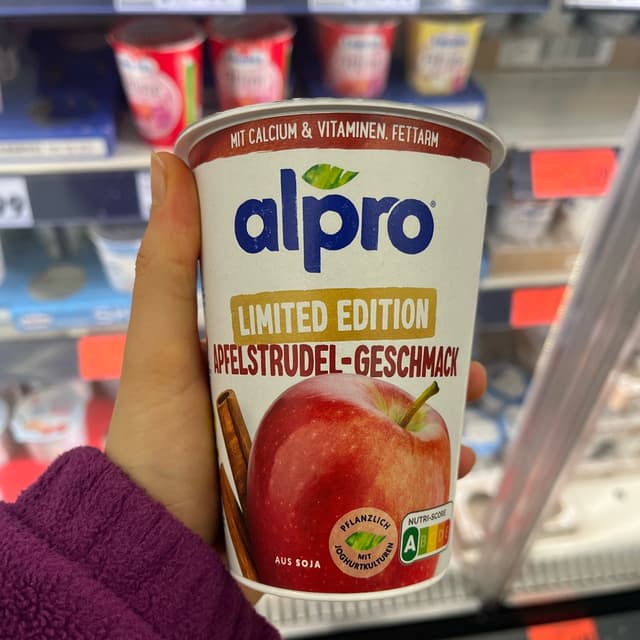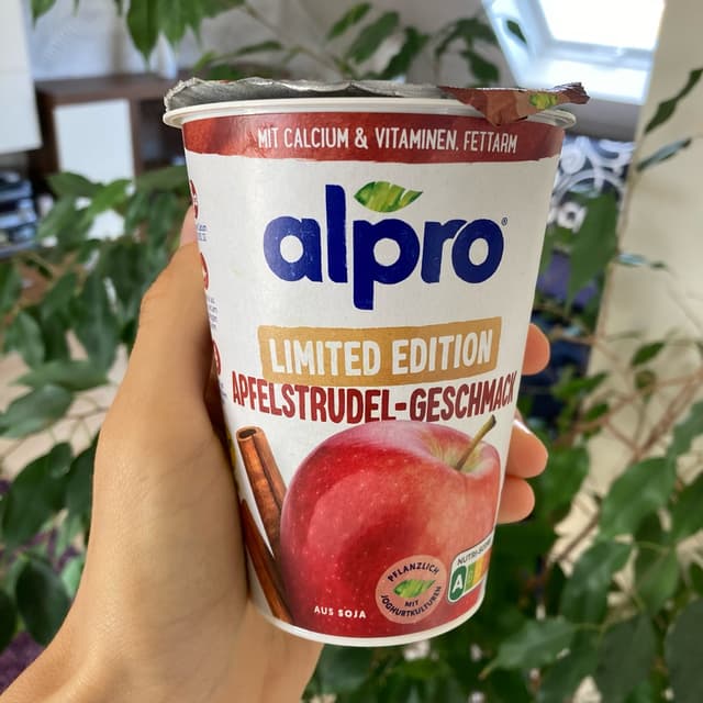 limited edition soy yoghurt with apple turnover flavour. original idea which is why i tried it the texture is smooth with some small apple pieces. tastes very sweet, appleish and like cinnamon. so a bit of apple turnover but too sweet for me. mixed it with normal soy yoghurt and it was good. available in 400g plastic cups only, price 1,99€ (->4,98€/kg). bought it when it was on discount for 1,49€. #soyyogurt #soyyoghurt #appleturnover #limitededition #alpro #vegangermany