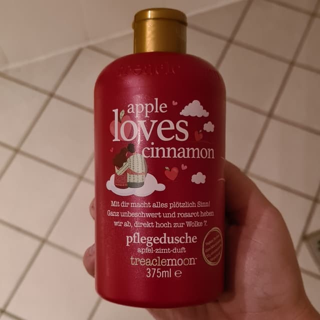 Shower gel with apple-cinnamon-scent in a CO2 neutral and recyclable package. The cinnamon smell is very strong but I love it. ~ 2,95€