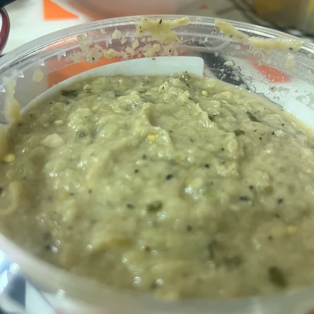 Strong astringence of eggplant - almost tastes like vinegar on the tongue. Still, it's enjoyable on bread/toast/pita.