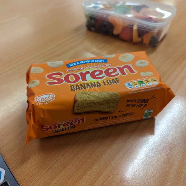 Ish youmy. But 4 days after da best before smells like too ripe banana lol. Great energy snack to have, also doesnt stick to the edges of the wrapper. 👍 11/11/23 13:58 #soreen #banana #bananabread #bananalover #loaf #maltloaf #loafcake #squidgy #bread #veganbread #vegan #veganapproved #nonveganapproved
