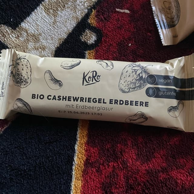 Non mi è piaciuta molto. È molto dolce e sa di cioccolato bianco con un retrogusto un po’ chimico di fragola. In mezzo ci sono pezzetti di anacardi. Trovata nel calendario dell’avvento di Koro