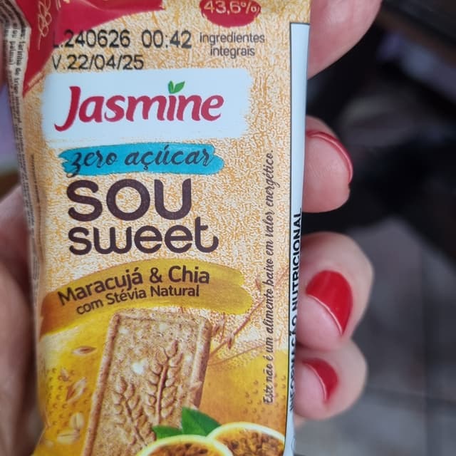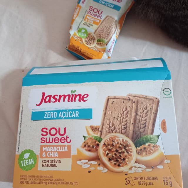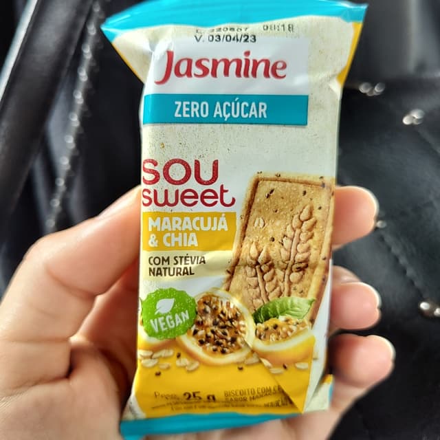 Biscoito com chia, sabor maracujá. Eles são bem gostosos e o mais importante que além de vegan, eles são zero açúcar.