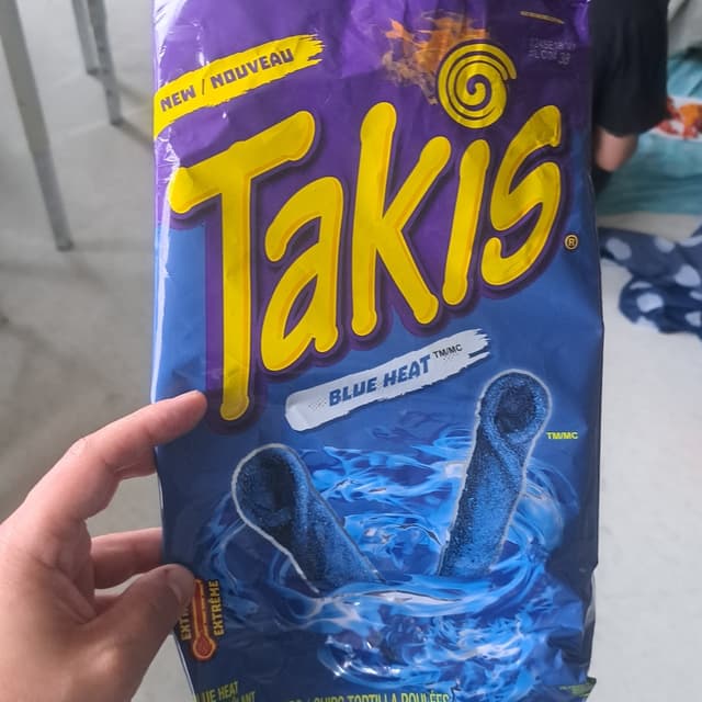 I had a party with my students yesterday where I baked them #homemade vegan chocolate chip cookies and they brought snacks and we watched a movie together. It was fun! One student brought these #blue Taki #chips. The colour looked wild and so many students' mouths were stained blue LOL! I checked and they were #vegan. I had one. I liked the flavour, surprisingly. I thought they were going to taste like blueberries LOL! It just tasted like #heat :P #spicy The student who brought them said they were $4.