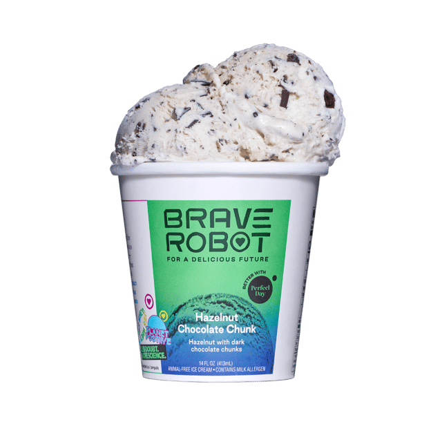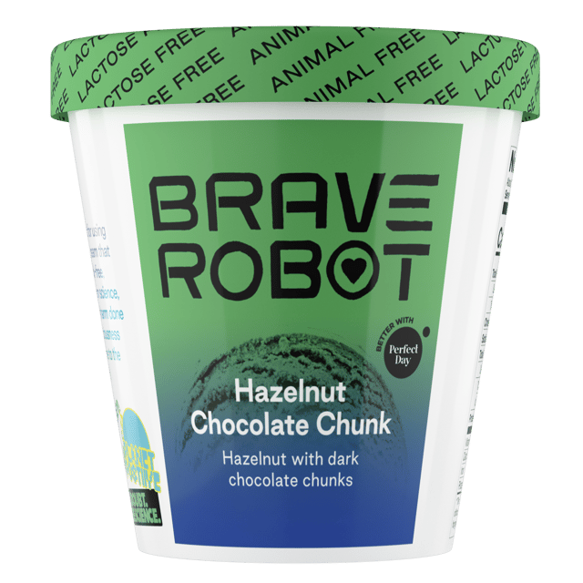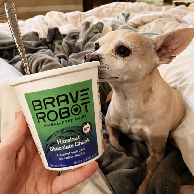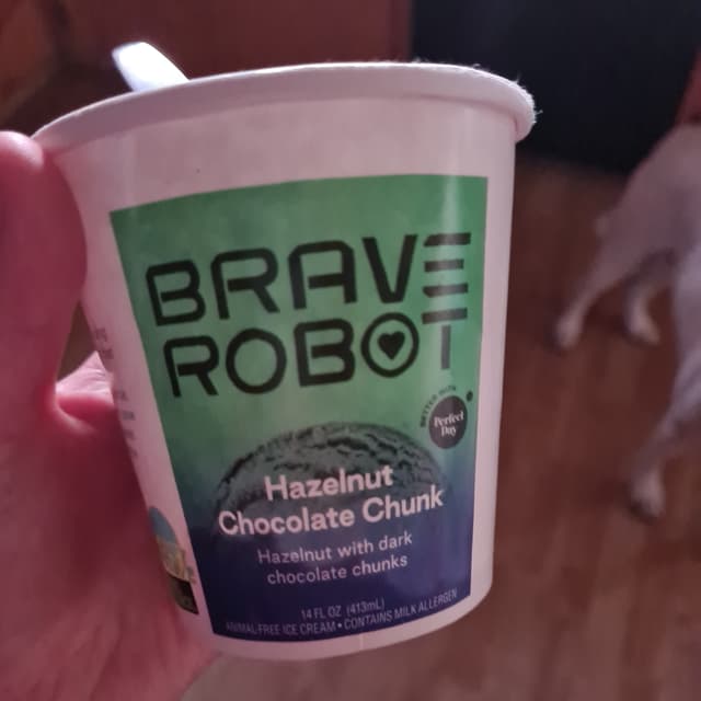 Got this delicious, not remotely healthy nice cream on sale for a couple bucks. Who doesnt love hazelnut flavored stuff? Knowing it didn't come from a place of animal torture & slaughter makes it a champ. . Perfect Day is animal-free and makes milk protein, yes this is whey, nutritionally identical to cow's milk but using flora fermentation. It is entirely cruelty-free and lactose-free. The company uses microbes and adds DNA sequences which instruct them to produce proteins and fats found in dairy milk. The microbes feed on sugars and other nutrients in big fermentation tanks and secrete the protein into the broth from which it can be harvested. Mandy wants to try some. Girl's persistent. This is my third brave robot ice cream review.