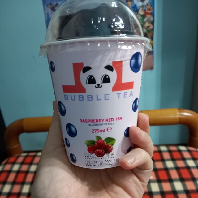 Non avevo mai provato una bevanda simile. Si tratta di un thé rosso aromatizzato al lampone con perle e succo di mirtillo, messe in un altro contenitore a parte. Ovviamente va mescolato tutto insieme. La bevanda risulta essere molto gradevole, dolce ma senza esagerare.