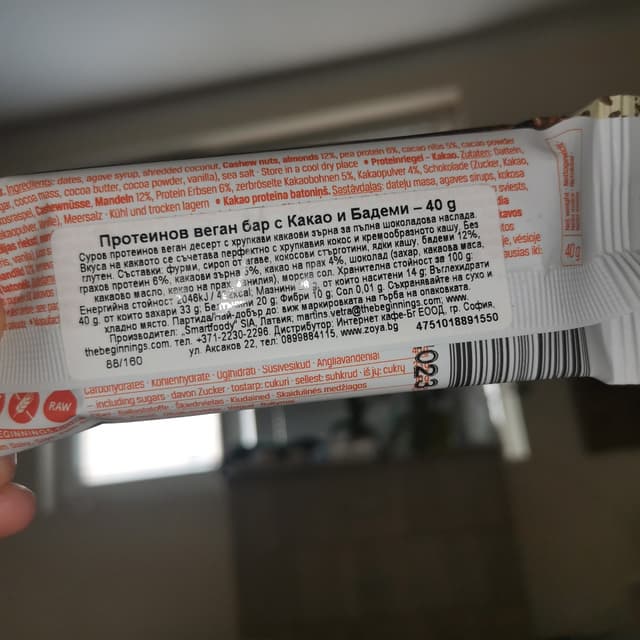 Barretta proteica a base di ingredienti vegetali, contiene datteri, sciroppo di agave, cocco, anacardi, mandorle, proteine di pisello e cioccolato. Molto buona e gustosa, ottimi valori proteici (20%), consigliata per uno snack sano e goloso. Inoltre è gluten-free e raw.