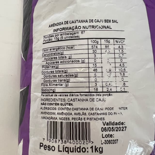 Castanha de caju torrada, sem sal , vem em pacote econômico de um kg, embalagem ecofriendly e livre de BPA, sem conservantes. É rica em proteínas vegetais e pode ser utilizada em receitas doces ou salgadas. Bom custo benefício.