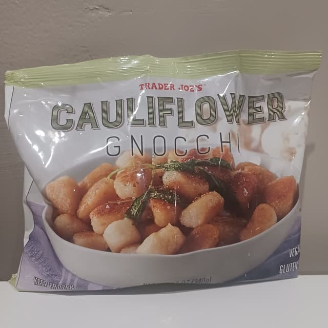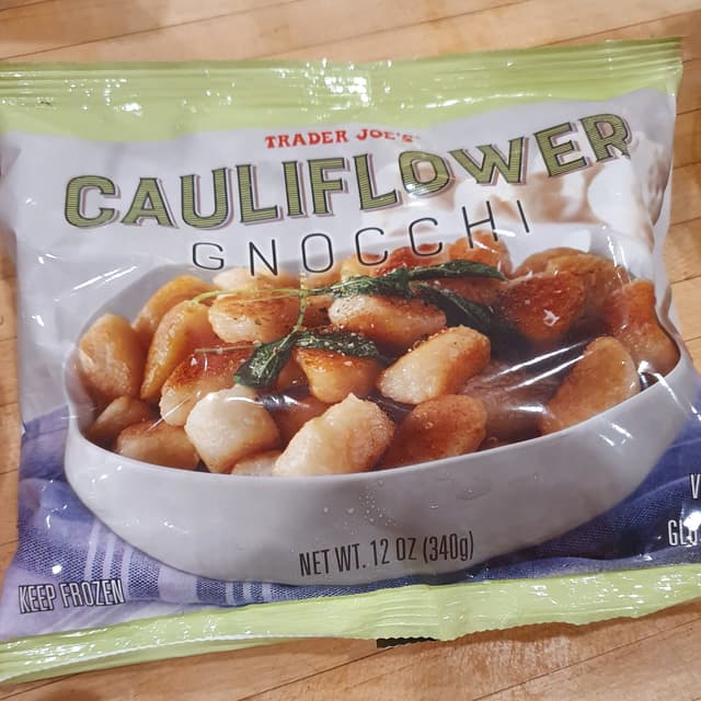 Trader Joe’s Cauliflower Gnocchi (NYOK-kee) is made for us in Italy, and it’s quite like those traditional Italian dumplings made of mashed potato, flour, and egg—hence, the Gnocchi designation. This version, however, is made with about 75% cauliflower, as well as cassava flour, potato starch, extra virgin olive oil, and sea salt. No wheat, sugar, dairy, or eggs are included here, and that translates to fewer carbs, with significantly less fat & calories than potato-based varieties.