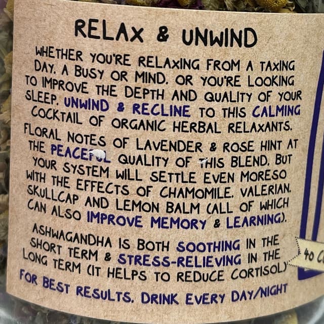 This organic herbal tea has chamomile, lemon balm, lavender, rose petals, jasmine flower, licorice root, scullcap.. A few others 😀 #organic