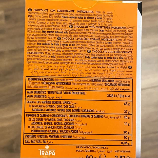 Los chocolates negros suelen tener el defecto de no ser suficientemente cremosos. No es el caso de Trapa. De entre las marcas de chocolate accesibles económicamente, es la mejor que he encontrado. En tiendas especializadas hay mejores, sí, pero tienes que desplazarte hasta ellas y pagar más.