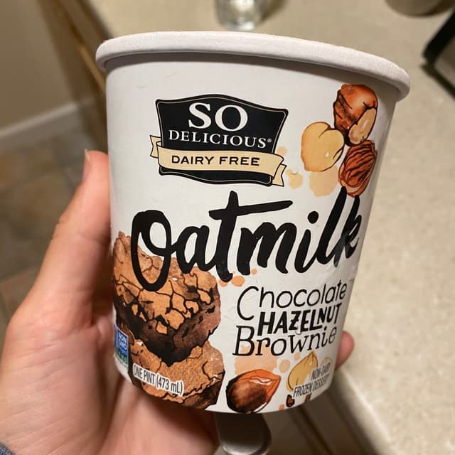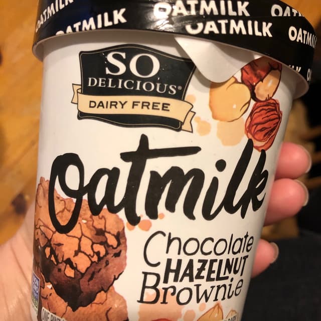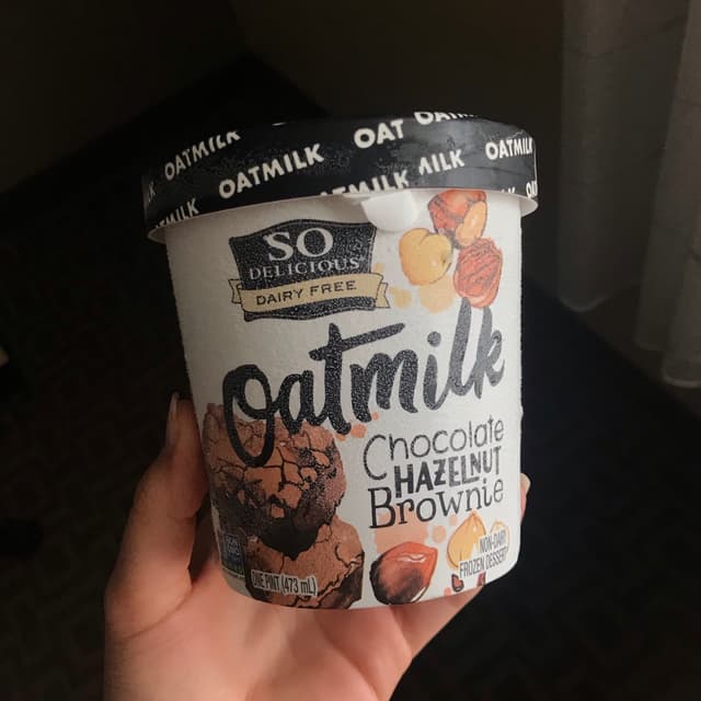 I could easily eat the entire tub of this in one sitting. The flavor and texture are really lovely. Rich brownie dough pieces, chocolate chips, and hazelnut butter, blended in frozen chocolate oatmilk. If you're a fan of nutella, you'll enjoy this dessert! 🤎 #SoDelicious #HazelnutLover #ChocolateLover #VeganIsNotScary