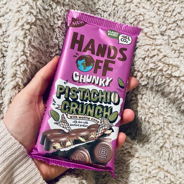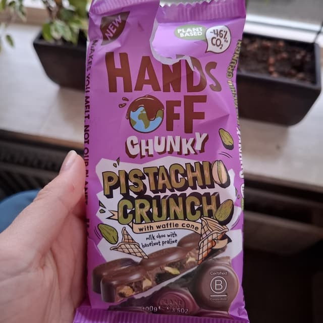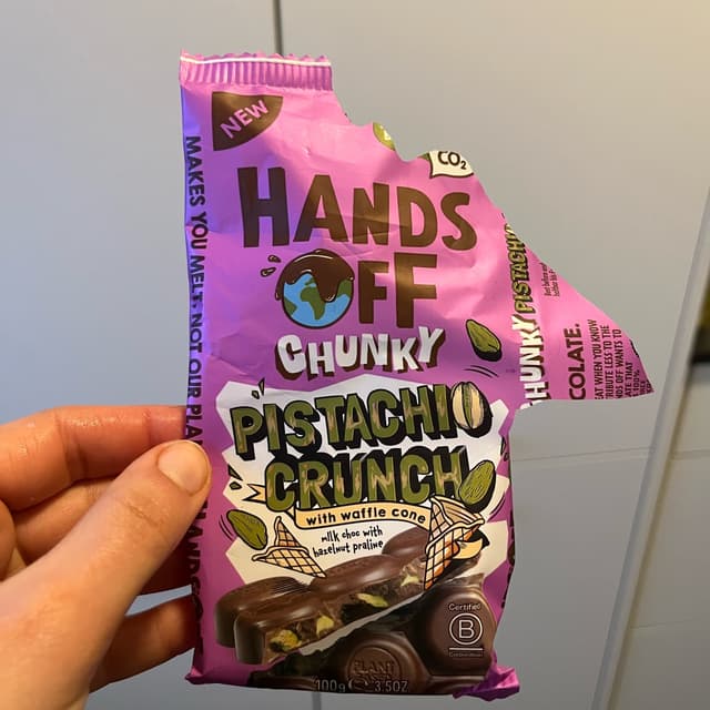 Hands off just came out with 3 new chocolate bars. This flavour is sooo yummmyyy. The combination of the pistachio and chocolate is great. The waffle adds some extra crunch.