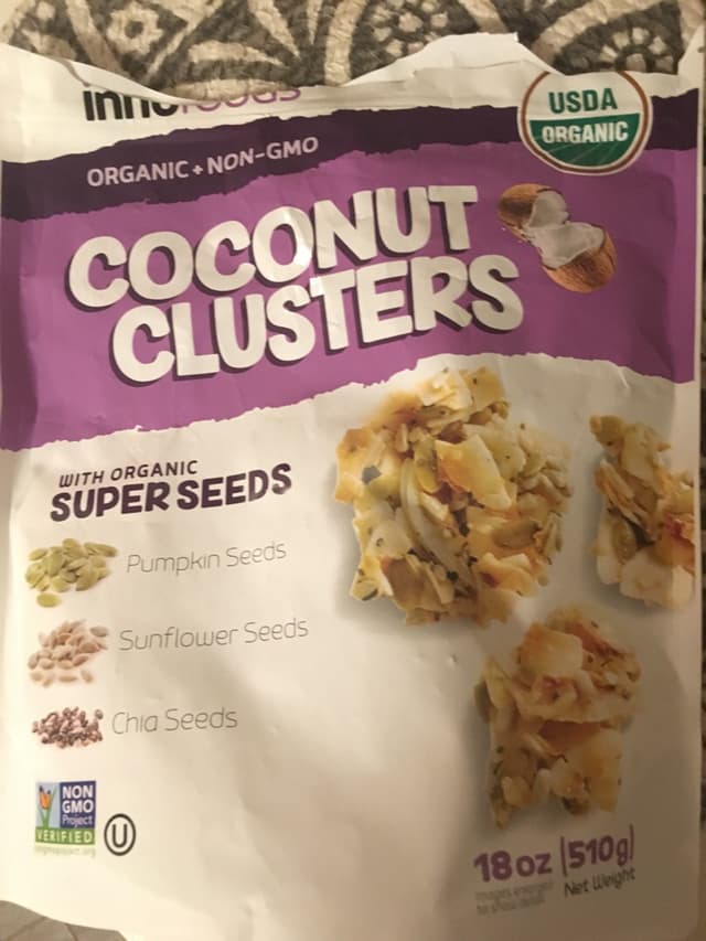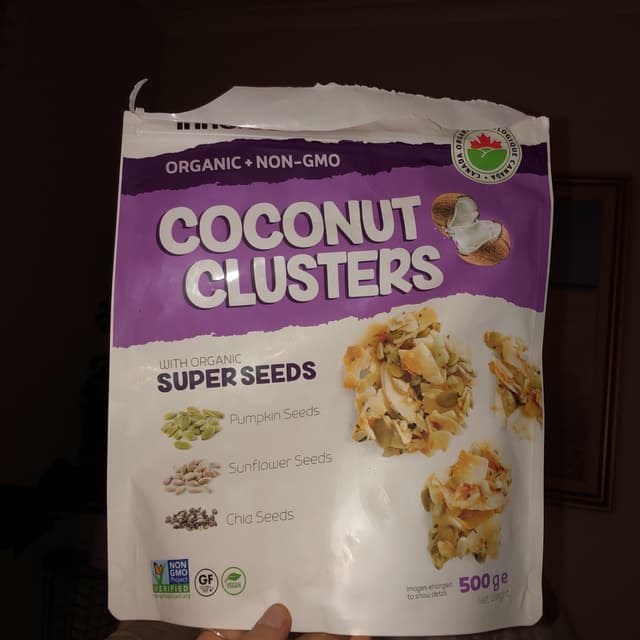 organic coconut, organic pumpkin seeds, organic sunflower seeds, organic cane sugar, organic brown rice syrup, organic chia seeds, and sea salt