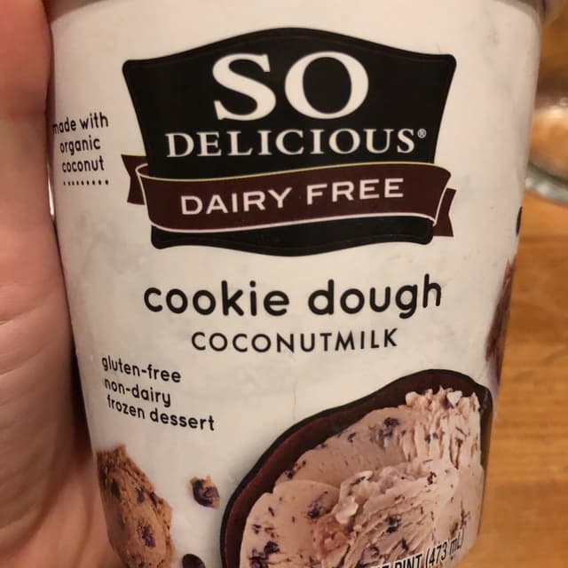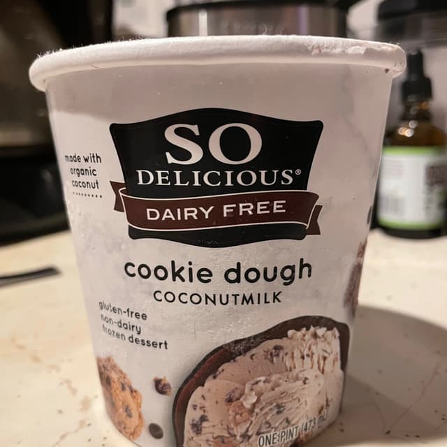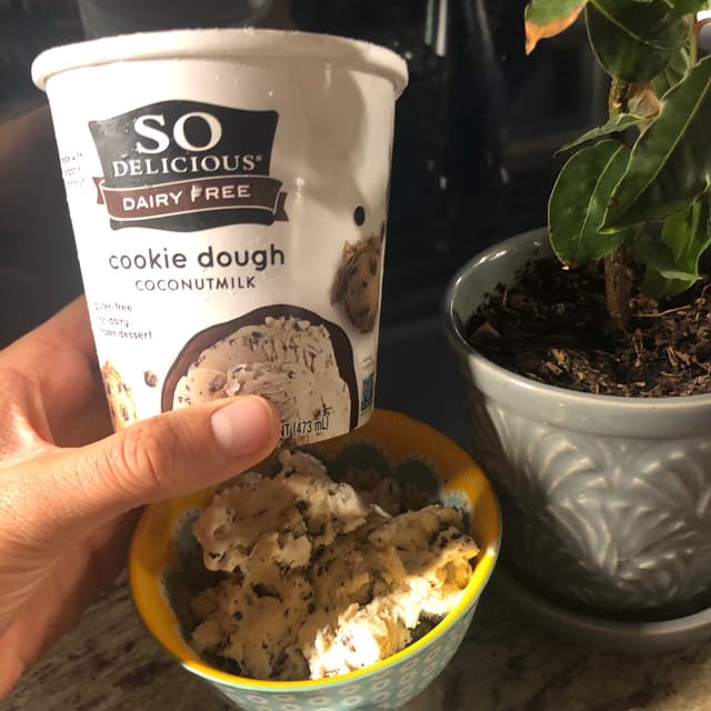 This is SO MUCH better than Ben & Jerry's. The ice cream base is a lovely coconutty and not overly sweet ice cream with flakes of dark chocolate, and the cookie dough melts in your mouth 🫠 my sister and I got a few bites before @ryanleys ate the whole container! 😂 #sodelicious #ditchdairy #icecream #veganicecream #cookiedoughicecream #dairyfree