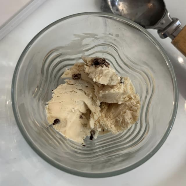 Un helado muy rico, con trozos de galleta blandita y trozos de chocolate.