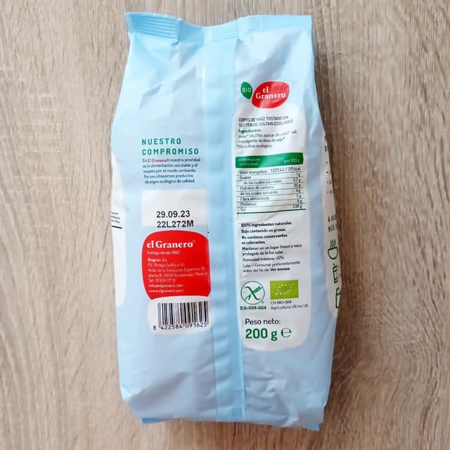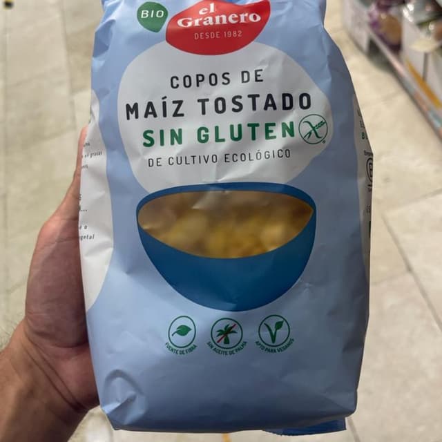 Copos de maíz tostado sin gluten. De cultivo ecológico. Sin colorantes ni conservantes. Contiene soja. Están muy ricos y tardan en ablandarse un poquito, para quien le guste tomarlos crujientes. Se pueden tomar con leche o yogur o utilizarlos para preparar barritas 😋 Tiene el certificado de empresa b. #singluten #glutenfree #cereales #agriculturaecologica #bcorp