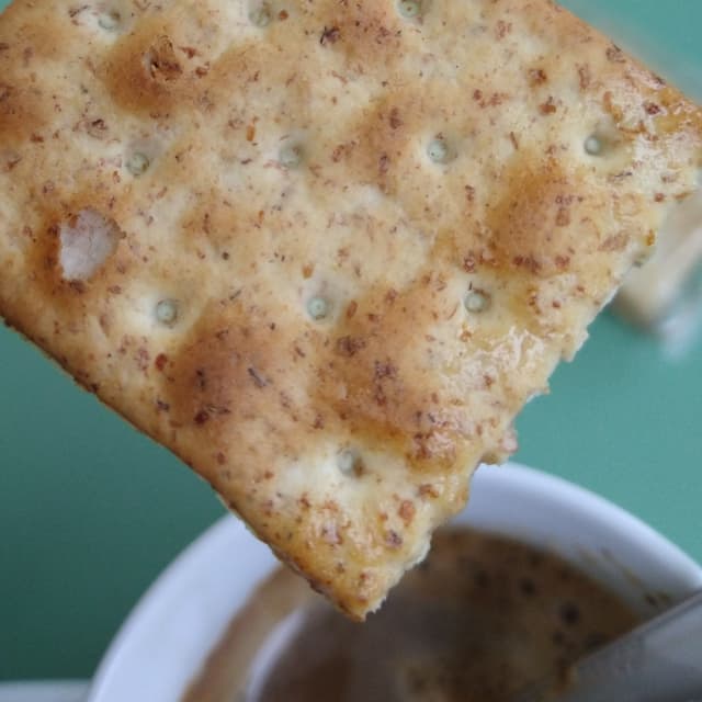 Crackers senza lievito e senza olio di palma. Sono spessi ma molto friabili. Lì ricomprerò, ma non sono il massimo per la colazione perché sono aromatizzati al rosmarino (avrei dovuto leggere bene gli ingredienti perché non era indicato sul fronte della confezione). #yeastfree #nopalmoil #organic #wholewheat