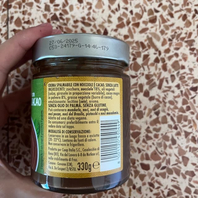Questa crema alla nocciola e cacao è molto buona, non contiene latte e come specificato sul retro della confezione è adatta a un’alimentazione vegana. 🌱 Ottimo gusto e ottima consistenza