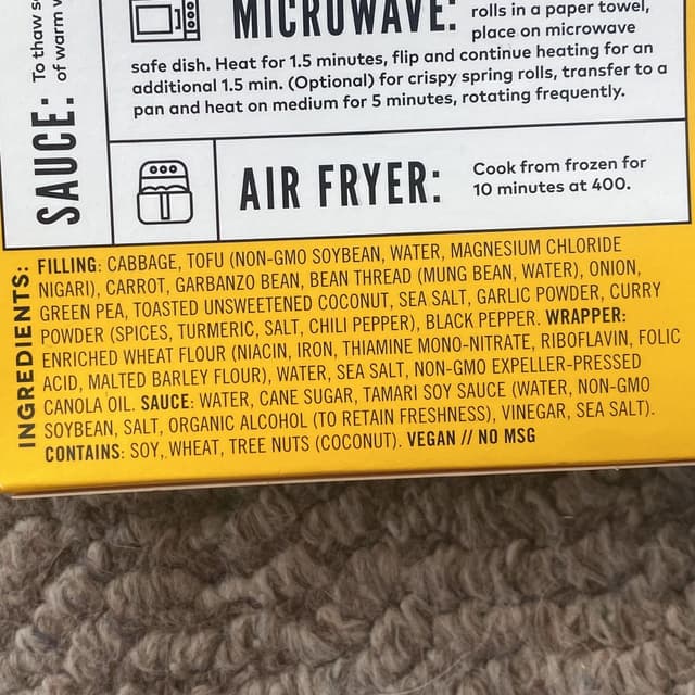 Sometimes I’ll buy something #justbecauseitsvegan — and a good discount never hurts, either! These eggless egg rolls were an intriguing find in the Safeway clearance freezer, and they sounded very easy to prepare, so into the basket they went. Based on the description, I was imagining something like a samosa, but in roll form. These seemed to be filled with mostly #tofu and some diced vegetables, which were flavored with the lightest touch of coconutty #curry. Regrettably, the spices weren’t nearly as intense as I would have liked — this almost needs to be paired with a curry dipping sauce, a la roti paratha. The wrapper crisped up well in the toaster oven, especially at the ends, though the middle remained a bit doughy due to the moisture of the filling. With regards to packaging, I liked that the egg rolls were just sitting inside the paperboard box, without any plastic save for the sauce packet. These are good as a #frozen #lazyvegan starter: a breeze to heat and reasonably satisfying (yet simultaneously nice and light,) though they could use some work in the flavor department. The full price of $5+ feels a bit ludicrous, but I might get them again if reduced.