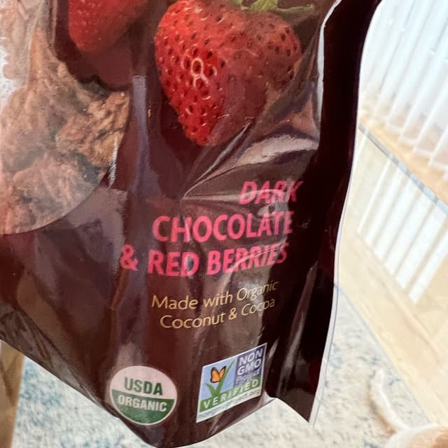 Amazing vegan granola! The granola bits themselves live up to the brands name with a nice crunch. They're larger chunks of granola. The chocolate is fair trade and delicious, with little bits scattered about. The berries are most scarce, but they are soft bits and flavorful. I'm not sure if they're dehydrated or how they're prepared, but I was surprised at their soft texture. Overall, I definitely recommend this granola. It's great on yogurt or on its own as a trail mix type snack.