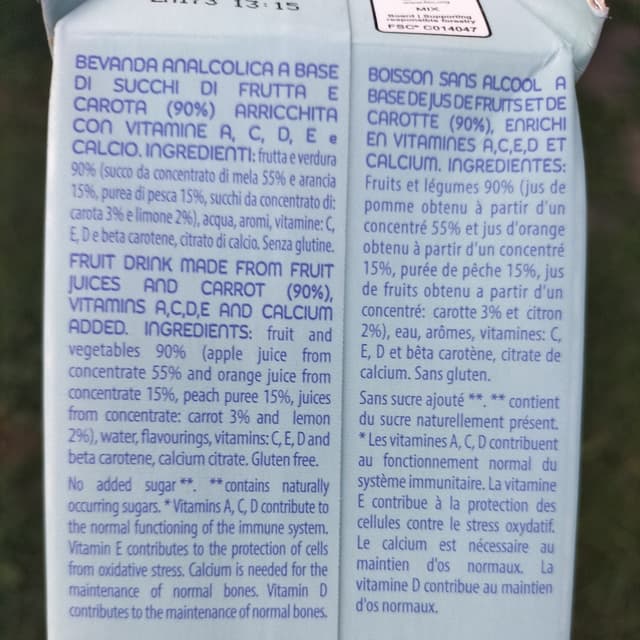 Uno dei miei succhi preferiti! È un ACE con aggiunta di pesca, dal gusto delicato e rinfrescante.