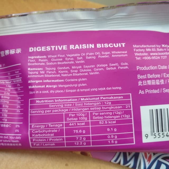 RM3.40. I won't normally grab the raisin version, but I did it "for the reviews". :p It's about the same as the other biscuits in the range, except with a few raisins also scattered in. When you first open the pack, you can smell a faint hint of raisins that you might get in a traditional (Malaysian) raisin biscuit. In soymilk, it seems to go soft slightly faster than the other flavours. Had it for breakfast on my cereal. Of the flavours in this range, I think I still prefer wholemeal and malt. There's also a Chocolate, but that one has cow's milk content. #buatanmalaysia