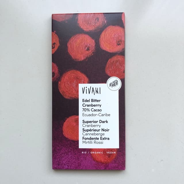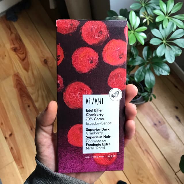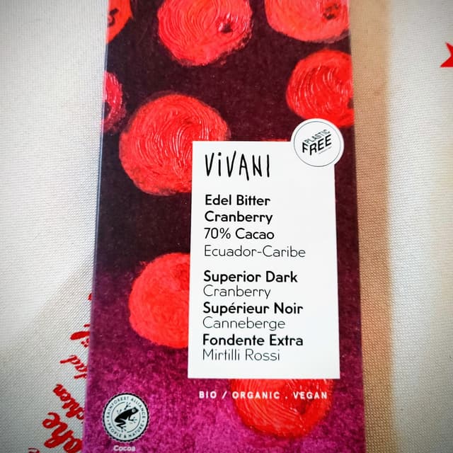 Ottimo cioccolato fondente al 70% con mirtilli rossi, l'ingrediente principale è la pasta di cacao quindi non risulta molto zuccherato. I mirtilli rossi all'interno donano un retrogusto acidulo davvero particolare. Altra nota positiva la confezione è plastic-free! #vivani #cioccolato #cioccolatofondente #darkchocolate #chocolate #mirtillirossi #cranberry