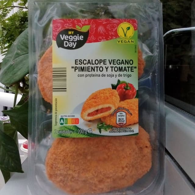 Escalopes rellenos de pimientos y tomate, sabor y textura muy agradable. Recomiendo hacerlos en el horno, salen más ricos. Los compré en Aldi a 2,19. No le doy 5 estrellas por el envoltorio y porque podrían contener más proteina, son 13 g de proteina por 100g.