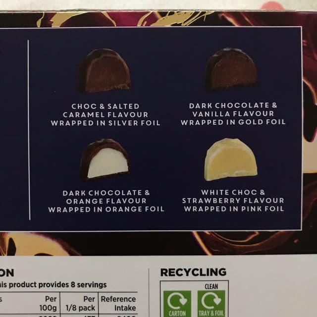 A really good mix of 4 different truffles including salted caramel, dark choc and vanilla, dark choc and orange & white choc and strawberry (my favourite).
