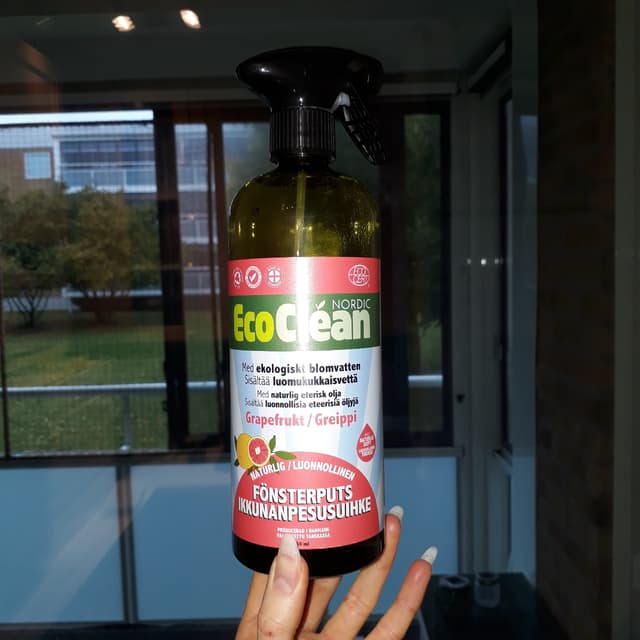 Window cleaning spray with grapefruit scent, does indeed smell very nicely 🍊 I love grapefruit so that makes cleaning the windows _slightly_ more bearable, but it still does not happen once a year even 😶 Would recommend this if you are better at window cleaning than i am :o