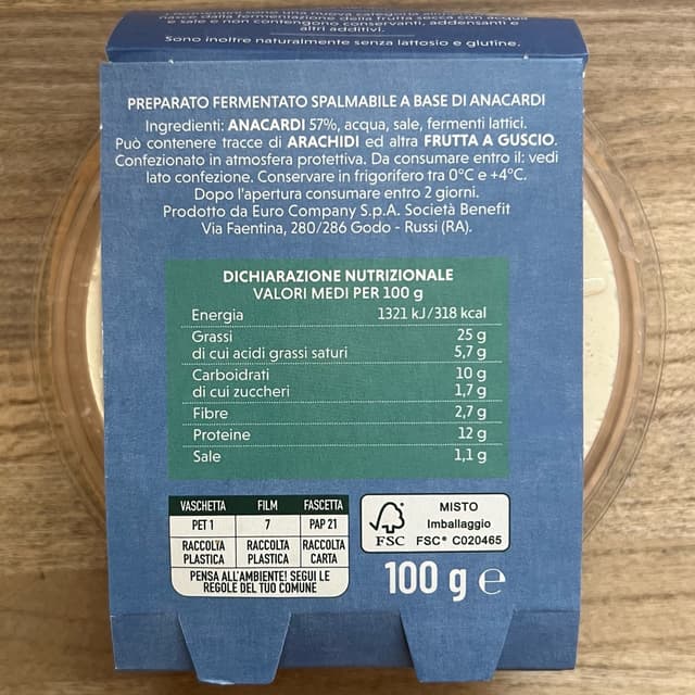 Preparato fermentato spalmabile a base di anacardi con solo acqua e sale, ricco di proteine e minerali, senza lattosio, senza glutine e senza conservanti, addensanti e altri additivi, con una consistenza cremosa, ideale da mangiare su una fetta di pane o per realizzare tartine, panini, torte salate, cheescake e mantecare risotti #formaggiospalmabile #formaggiodianacardi #senzaglutine #senzaadditivi
