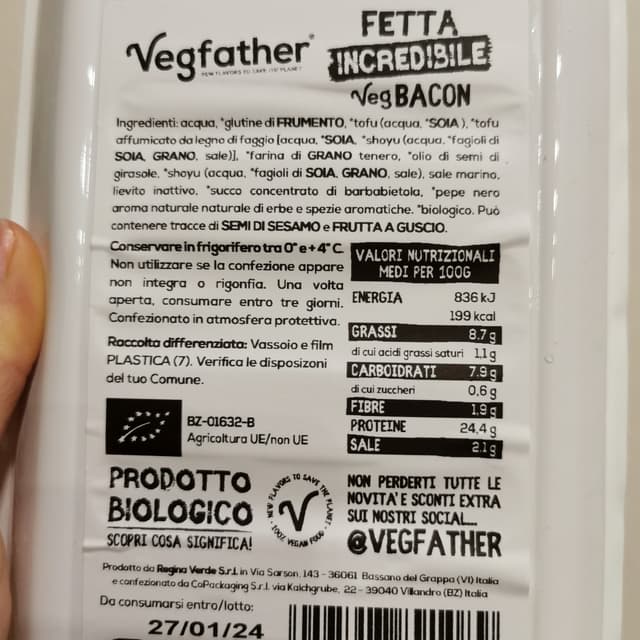 Non avevamo mai visto il vegbacon e spinti dai ricordi positivi dei prodotti di questa azienda abbiamo voluto testarlo. Purtroppo non è per nulla affumicato e bisogna fare attenzione a non friggerlo troppo altrimenti diventa una soletta. Se lo si lascia raffreddare un pochino risulta leggermente più saporito, ma alla fine della fiera l'unica causa di sapidità è la grande quantità di sale a dispetto degli aromi impercettibili. Tirando le somme, carino l'aspetto marmorizzato, ma un fake bacon fatto in casa, pure con le semplici carote e i giusti aromi, dà più soddisfazione, considerando anche la confezione in #plastica per soli 90 g di prodotto #unsustainable 💰 3,40 € 📍 IperBiobottega di Torino #veganbacon #fakemeat #readymeal