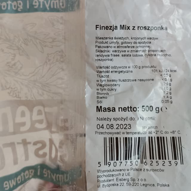 eisberg simply fresh Finezja Mix z roszponką Mieszanka świeżych, krojonych warzyw. Produkt umyty, gotowy do spożycia. Pakowano w atmosferze ochronnej. Składniki: warzywa w zmiennych propozycjach (endywia frisee, sałata lodowa, cykoria radicchio, roszponka) Wartość odżywcza w 100 g produktu: Wartość energetyczna: 101 kj/ 24 kcal Tłuszcz: <0,5 g W tym kwasy tłuszczowe nasycone: <0,1 g Węglowodany: 2,9 g W tym cukry: 1,0 g Błonnik: 1,2 g Białko: 1,4 g Sól: 0,05 g Masa netto: 500 g Opakowanie zostało spożyte przed 04.08.2023😎