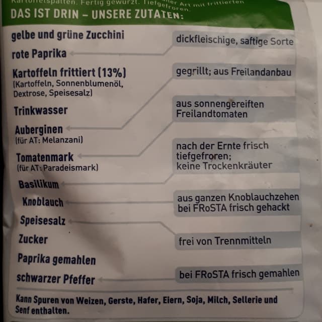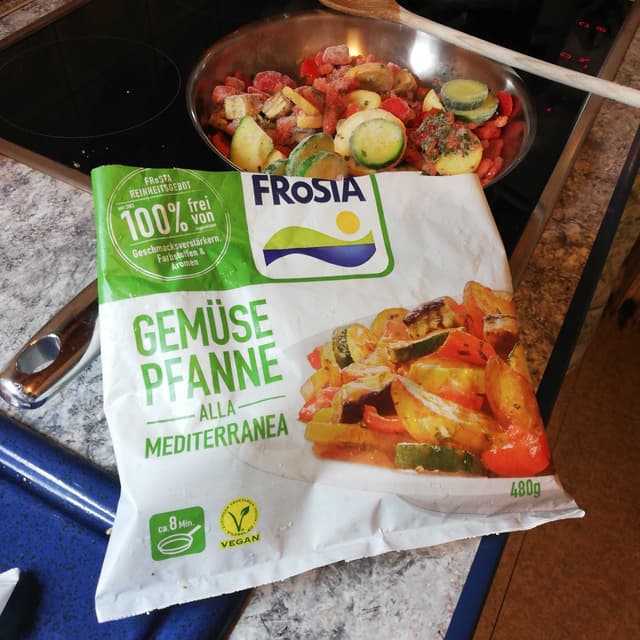 Delicious frozen ready meal with potatoes and different vegetables (yellow and green zucchini, eggplant and red bell pepper) with various herbs and spices. Can be fried in the pan or prepared in the microwave with a bit of oil. Aromatic and good serving size, only downside is that the zucchini, like with all frozen ones, is quite soft and spongy, I prefer fresh over frozen zucchinis. Price 2,54 €.