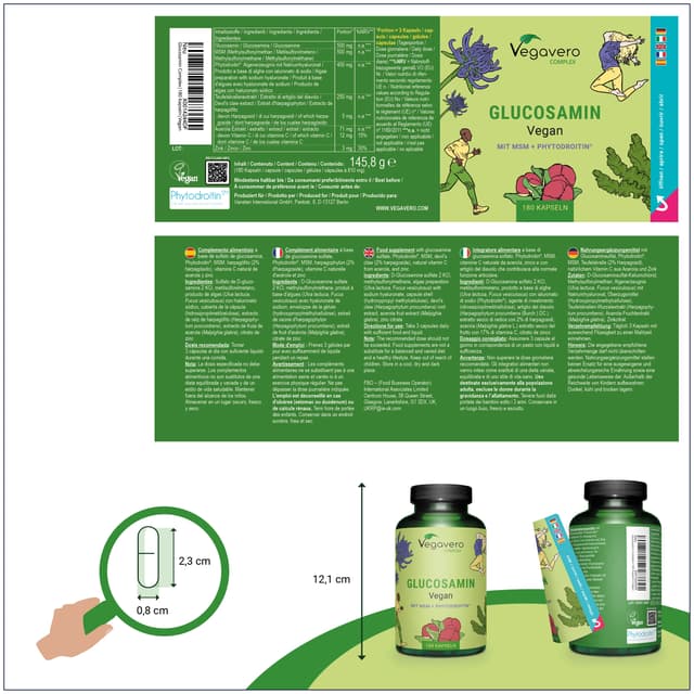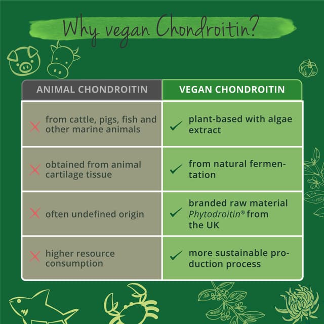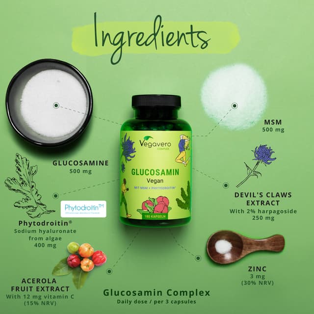 Unique vegan supplement for joints with 400 mg Phytodroitin® (chondroitin), 500 mg glucosamine, 250 mg devil's claw extract, zinc 3mg, 12mg vitamin C and 500 mg MSM per daily dosage Recommended dosage: 3 capsules per day 180 capsules/bottle