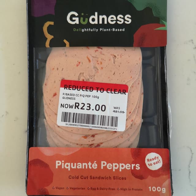 Güdness Picante Peppers Cold Cut Sandwich Slices are a plant-based alternative to traditional cold cuts. Made with a blend of peppers, these slices offer a spicy and flavorful option for sandwiches. At a reasonable price of R29.99, they provide a guilt-free way to satisfy your cravings. The slices are easy to handle and convenient for busy lunches. Some customers have reported enjoying the taste of these slices, but others may prefer a milder flavor. Overall, these slices offer a unique and plant-based option for sandwich lovers.