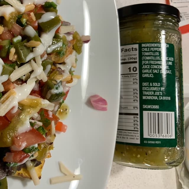 For the fans of #welikeitspicy, this Green Hatch Salsa from Trader Joe's was a bit mild for us. Loved the flavor, just needed more kick! Did make our Friday night tostadas taste even more amazing then without it! #simpleingredients $2.99 #veganinillinois #greensalsa #traderjoes #tasty #vegantostadas #delicious #vegan4life #vegan4theanimals #vegan4theplanet #abillionlove